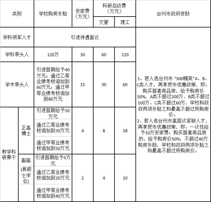 注:(1)臨床醫學院博士引進待遇采取臺州市政府、附屬醫院和學校三方疊加的方式,其中學校給予一次性購房補貼20萬元、安家費4萬元和科研啟動經費14萬元;(2)國內非在職博士后臺州市另提供10萬元安家補貼和10萬元的科研經費;(3)全職引進的學科領軍人才和學科帶頭人,以及特別優秀的學術帶頭人可實行年薪制。學校根據引進人才層次和承擔的職責與其協商確定年薪標準和發放方式等,簽訂年薪制聘用合同;(4)引進人員的配偶如屬引進對象,則全額享受學校相應的引進待遇,若不屬于引進對象,具有博士學位或副高(具碩士學位),學校如安排其教學崗位,則僅給予相應的科研啟動費。(5)對引進的特別優秀的海外高層次人才,達到高級專業技術職務的業績條件,可以給予相當于副高級專業技術職務的年薪待遇。引進后3年內達到學校正高級專業技術職務的業績要求者,可直接申報正高級專業技術職務,3年內若未獲通過,則取消副高級專業技術職務年薪待遇,并按正常評聘條件和程序申報;(6)引進的學科領軍人才、學科帶頭人、學術帶頭人和教學科研骨干(博士、副高)到校工作后,學校提供為期24個月的免費周轉房。如因學校暫時不能提供周轉房,則每月分別提供學科領軍人才、學科帶頭人、學術帶頭人和教學科研骨干2500、2000、1500和500元的租房補貼。