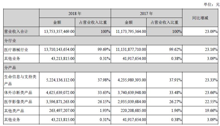 年報顯示,邁瑞醫療2018年實現營業收入137.53億元,同比增長23.09%;凈利潤37.19億元,同比增長43.65%。利潤總額42.38億元,較上年同期增長44.59%;實現歸屬于上市公司股東的凈利潤37.19億元,較上年同期增長43.65%。